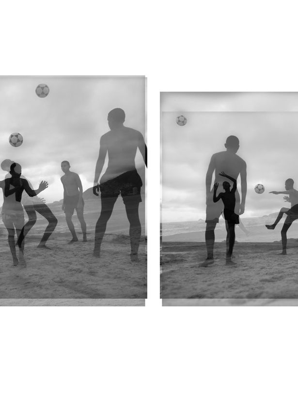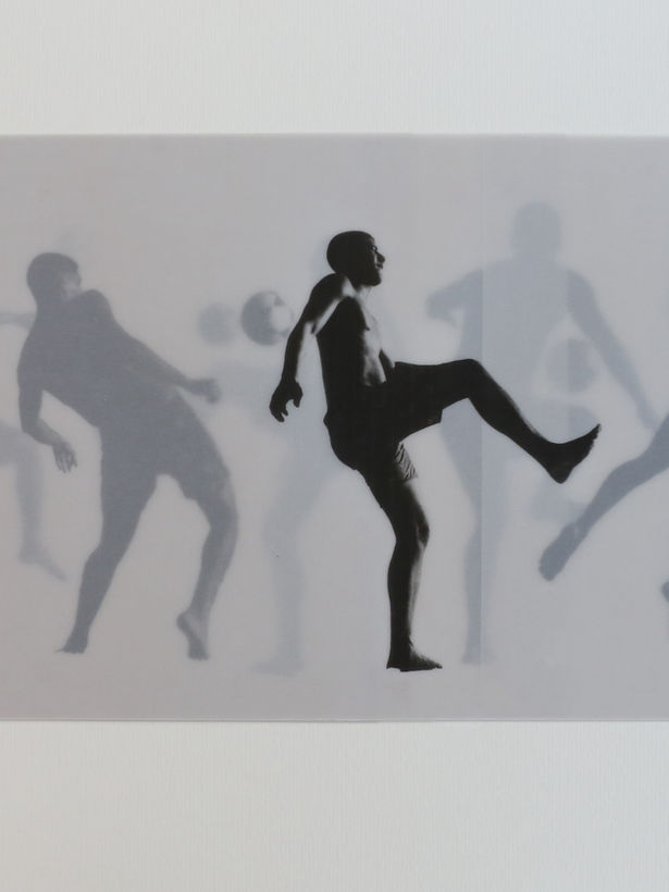 Dans mes photographies, j'observe les mouvements fascinants des joueurs qui jonglent, dansent, sautent et gardent toujours le ballon en altitude. J'ai alors choisi de mélanger et de superposer ces photographies avec des tirages sur papier calque, dans des découpes qui isolent les corps et les mouvements. La dilution des formes, des corps et des arrière-plan permet de les réunir dans la transparence du papier ; ainsi naît un récit et une chorégraphie qui semble rythmé au son d'un tambour, dans un mouvement qui se multiplie dans un seul cadre. Les joueurs d'Altinha semblent désormais frapper la balle au son d'un berimbau ou au rythme d'une litanie.